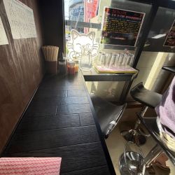 店内は赤.黒基調で狭小な、今日現在下に棚のある厨房向きL字カウンター4席と壁向きカウンター1席、4人掛けテーブル席が2卓ありお水は卓上のピッチャーにてセルフ(奥正面にお手洗いあり)。
