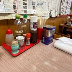 卓上には割り箸、楊枝、ティッシュ、灰皿😵💫が備えてあり調味料はギャバンブ... 続きを見る